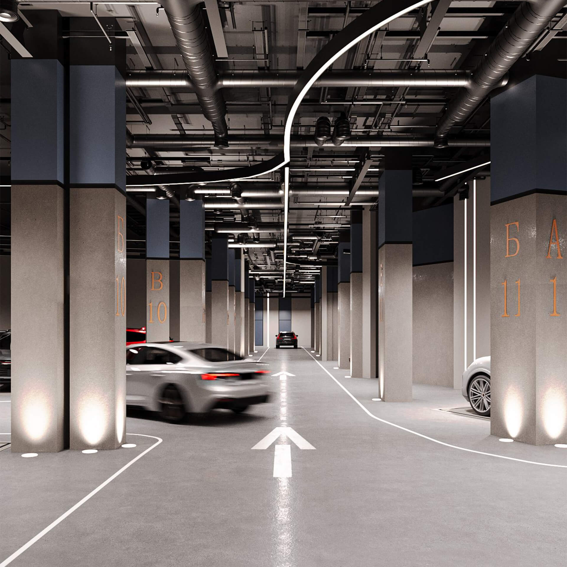 Кроме стандартных машино-мест предусмотрены VIP-зоны, точки зарядки электромобилей, зоны ожидания для такси и курьеров, доступные резидентам комплекса. Въезд осуществляется через цифровой пропуск или мобильное приложение, что повышает скорость и удобство. Все зоны оборудованы круглосуточным видеонаблюдением, усиленной связью, освещением и защищены от климатических воздействий — всё это обеспечивает высокий уровень безопасности и логистики.
